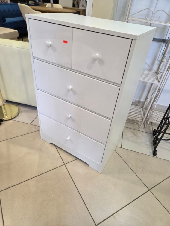Pięć przestronnych szuflad oferuje dużo miejsca na odzież, akcesoria lub codzienne przedmioty, pomagając zachować porządek i utrzymać wnętrze w eleganckim, minimalistycznym stylu. Górna powierzchnia komody wytrzymuje obciążenie do 50 kg, a każda szuflada do 8 kg, co pozwala na dodatkowe dekoracje lub przechowywanie codziennych przedmiotów.
