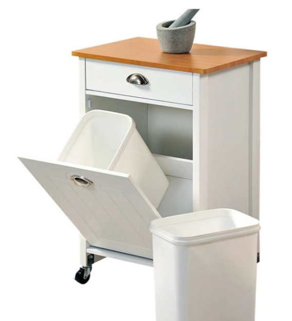 Stylowe połączenie bieli z blatem w kolorze drewna sprawia, że wózek wygląda jak elegancki mebel, a nie pojemnik na odpady.